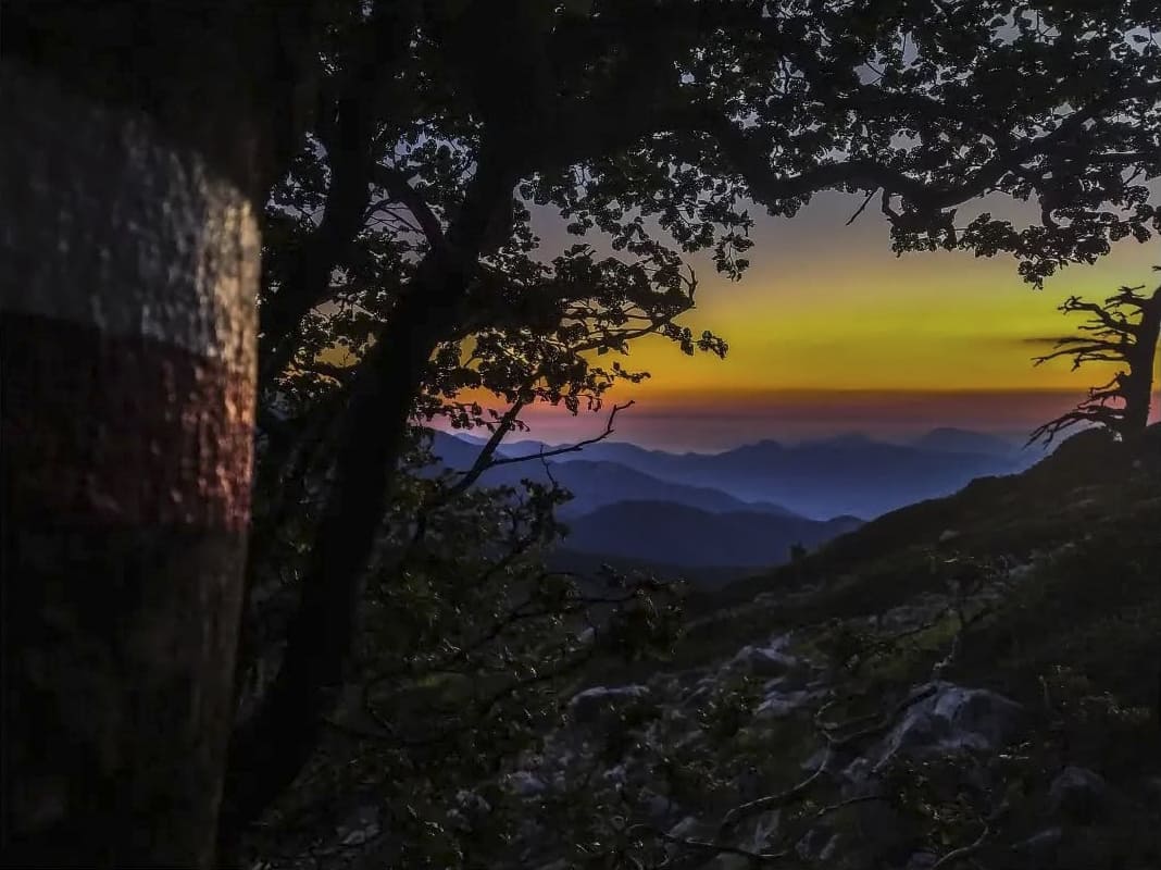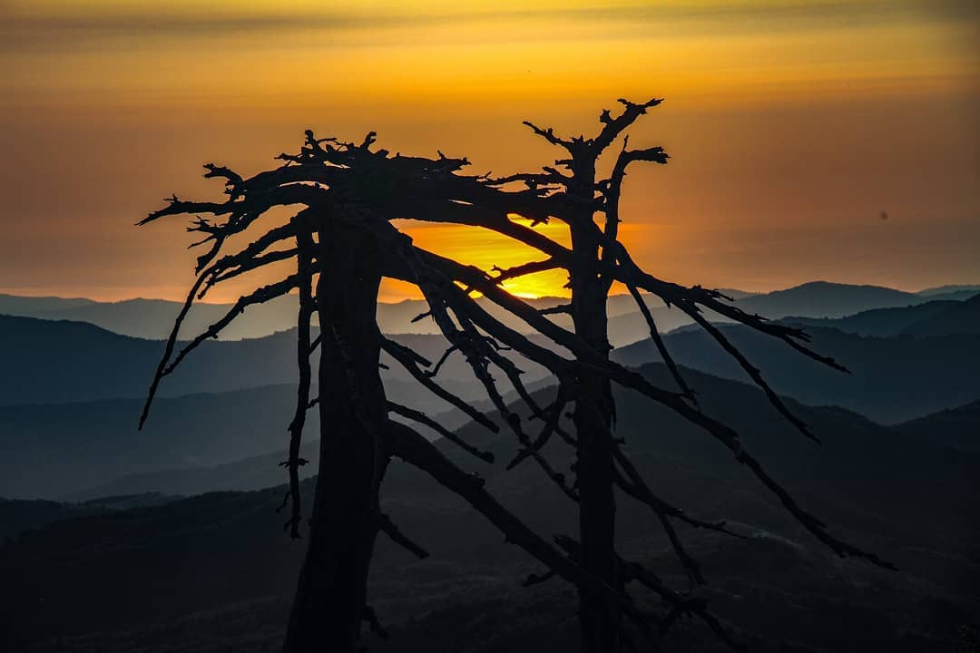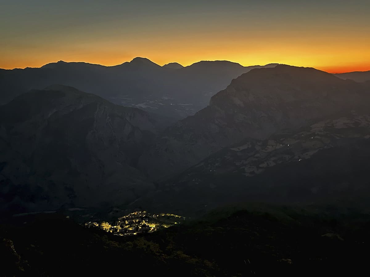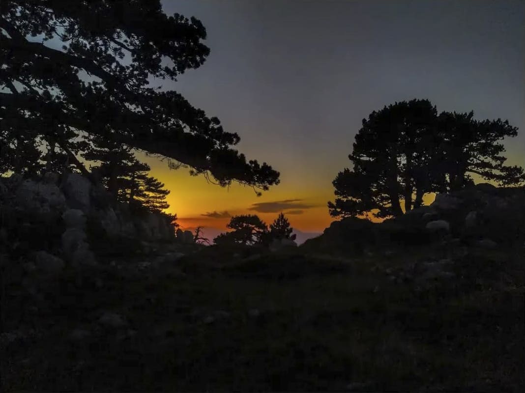Il tramonto nel Pollino ha un’energia diversa: è intenso, a tratti drammatico. Il cielo si colora di rossi profondi e arancioni vibranti, mentre le sagome dei pini loricati si stagliano come sentinelle millenarie.