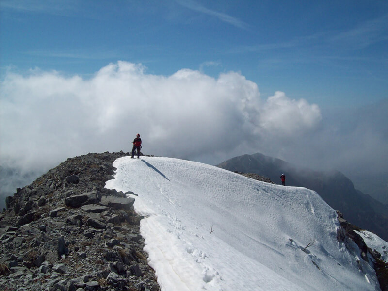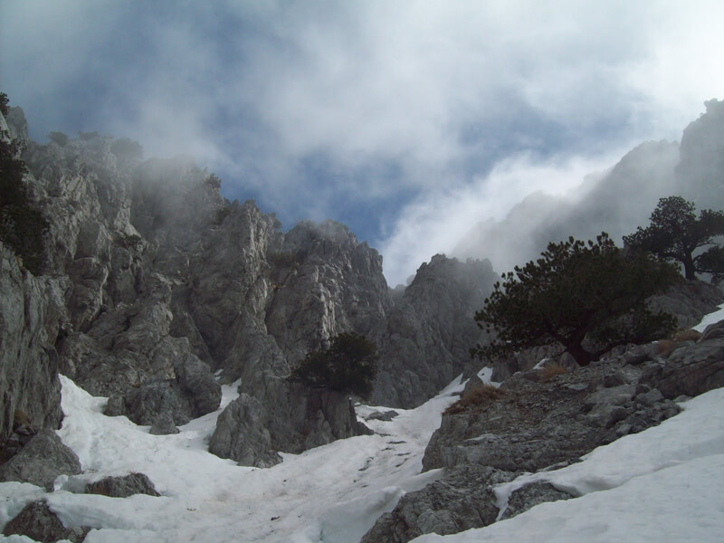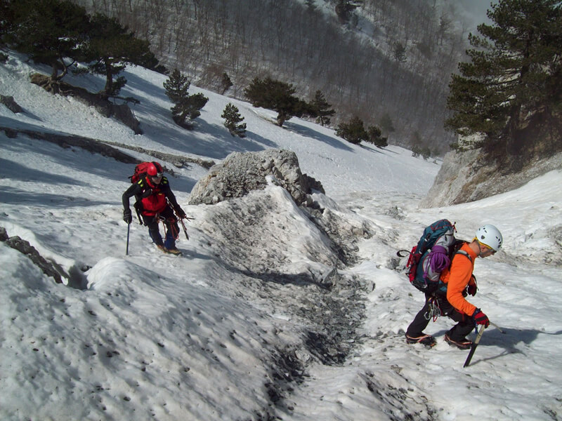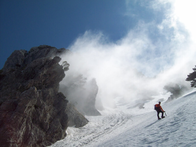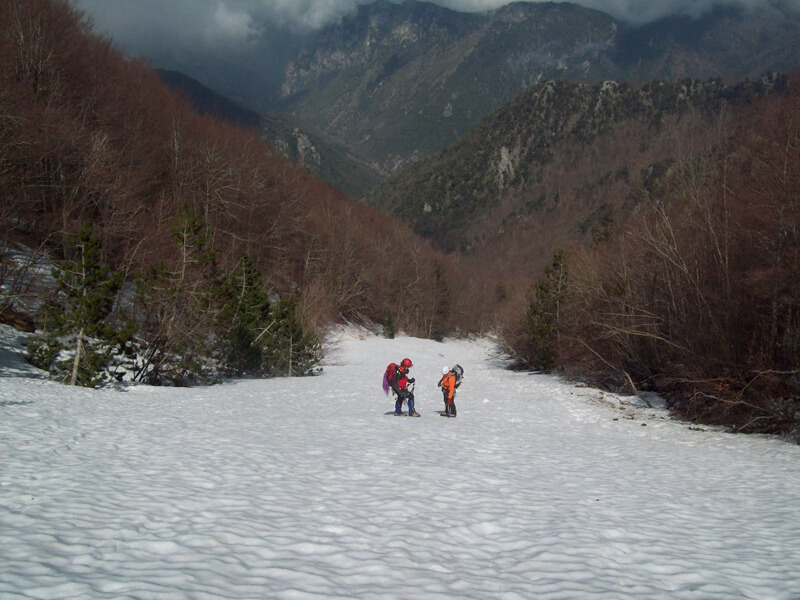 Ma finalmente arriva il momento di andare... si parte di buon'ora verso Buonvicino, e raggiunta la località Serrapodolo, comincia la nostra avventura. Quando giungiamo alla neve possiamo subito constatare che è compatta, e questa è un'ottima cosa, la nostra marcia di avvicinamento ai canalini sommitali sarà così più agevole. Intanto i vapori di bianche nuvole ci avvolgono risalendo dal mare e ci tolgono la visuale per lunghi tratti, per poi mostrarci di tanto in tanto la maestosità nella quale siamo immersi...
