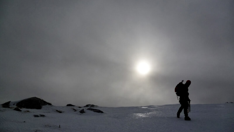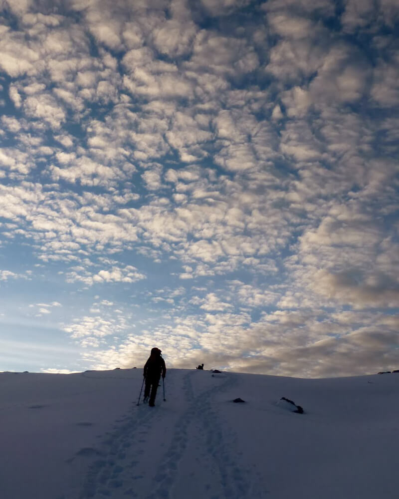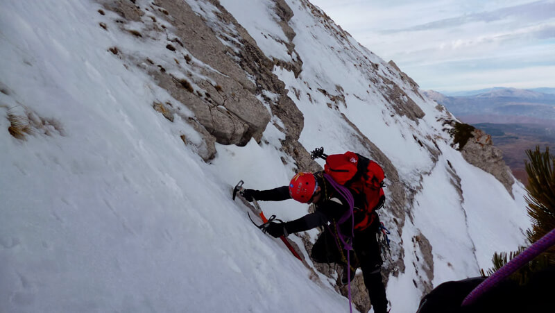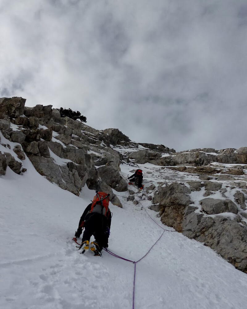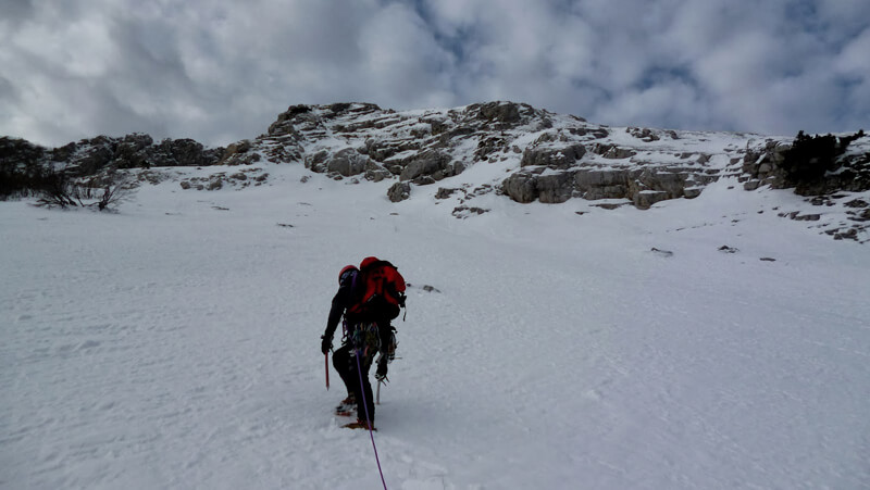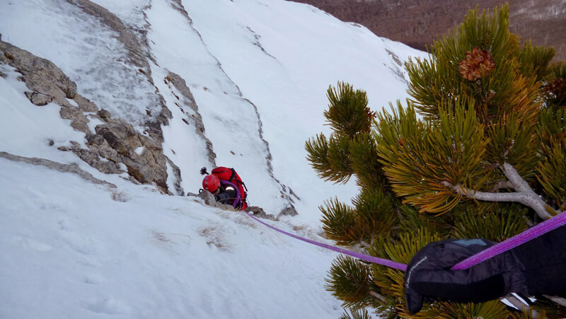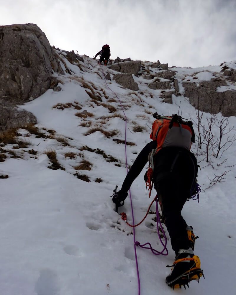 La parte centrale della Via Psicologica alterna pendenze decise e passaggi più tecnici, caratterizzati da strettoie, brevi risalti e tratti misti che richiedono esperienza e consapevolezza dell’ambiente invernale. Un punto particolarmente suggestivo è rappresentato dal solitario pino loricato che si incontra lungo la salita, simbolo di resistenza e riferimento naturale.