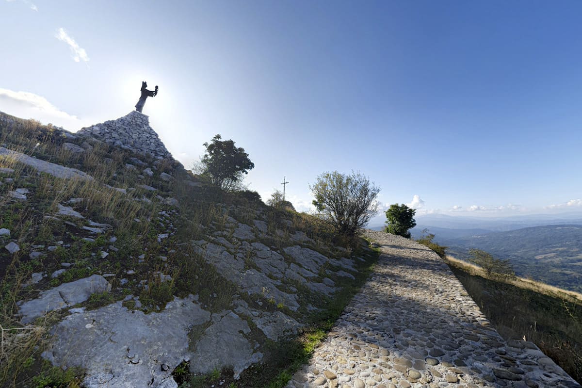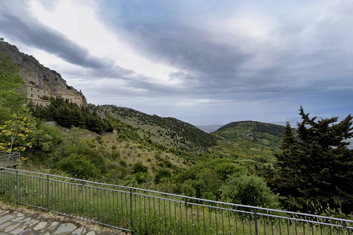 Da qui il panorama si apre in modo profondo e solenne, offrendo una visione che unisce spiritualità, silenzio e grande paesaggio montano. Un luogo dove lo sguardo corre lontano e il Pollino si mostra nella sua dimensione più autentica e contemplativa.