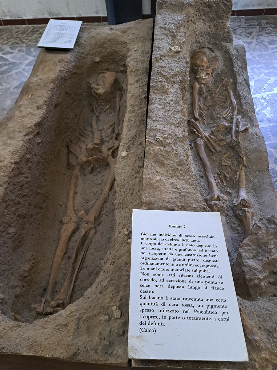 La grotta si divide in due sale di circa 20 mt e formate da roccia calcarea e percorribili attraverso un cunicolo di circa 34 mt stretto e privo di luce in direzione est-ovest. L'uomo del Romito apparteneva alla stirpe cro-magnon e non praticava nè allevamento, nè agricoltura e nè lavorazione della ceramica.