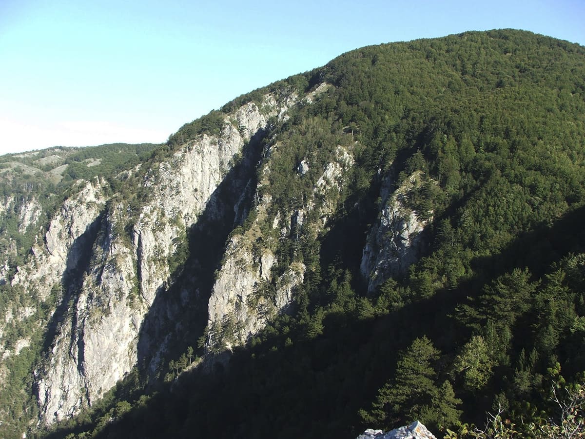 La zona si sviluppa intorno al Corno Mozzo, una cima piramidale che domina l’orizzonte. Qui i crivi si ergono come imponenti guglie di calcare grigio, instabile e affascinante, circondate da pini loricati, simbolo indiscusso del Pollino, e da profonde vallate selvagge.